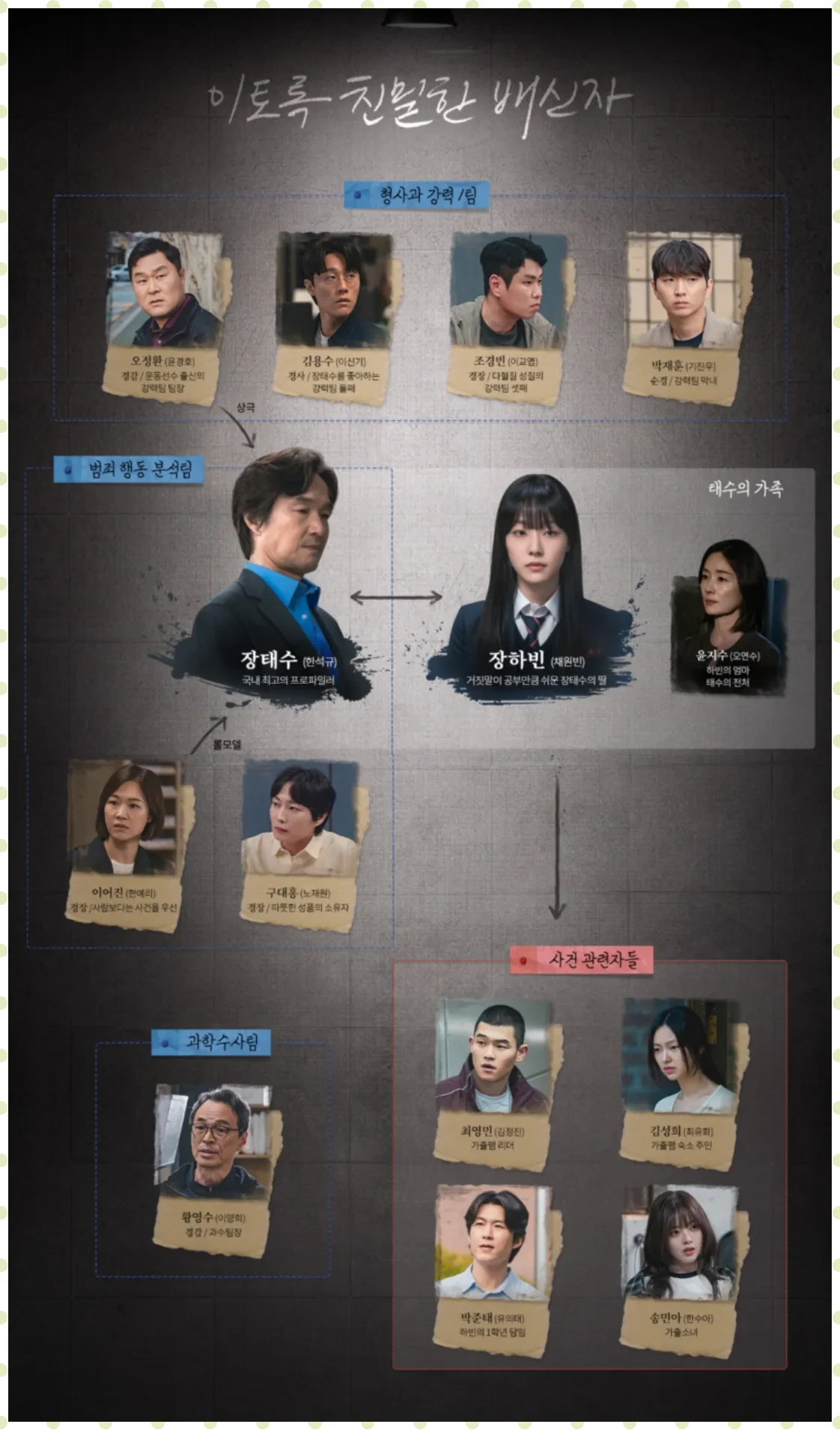 한국 최고의 프로파일러 태수가 살인범죄와 딸이 연관되었다는 것을 알게 되면서 처절하게 무너져가면서 진실을 쫓는 슬릴러 드라마입니다. 그에 따라 범죄 행동 분석팀과 형사과 강력팀이 등장인물로 대거 등장합니다.